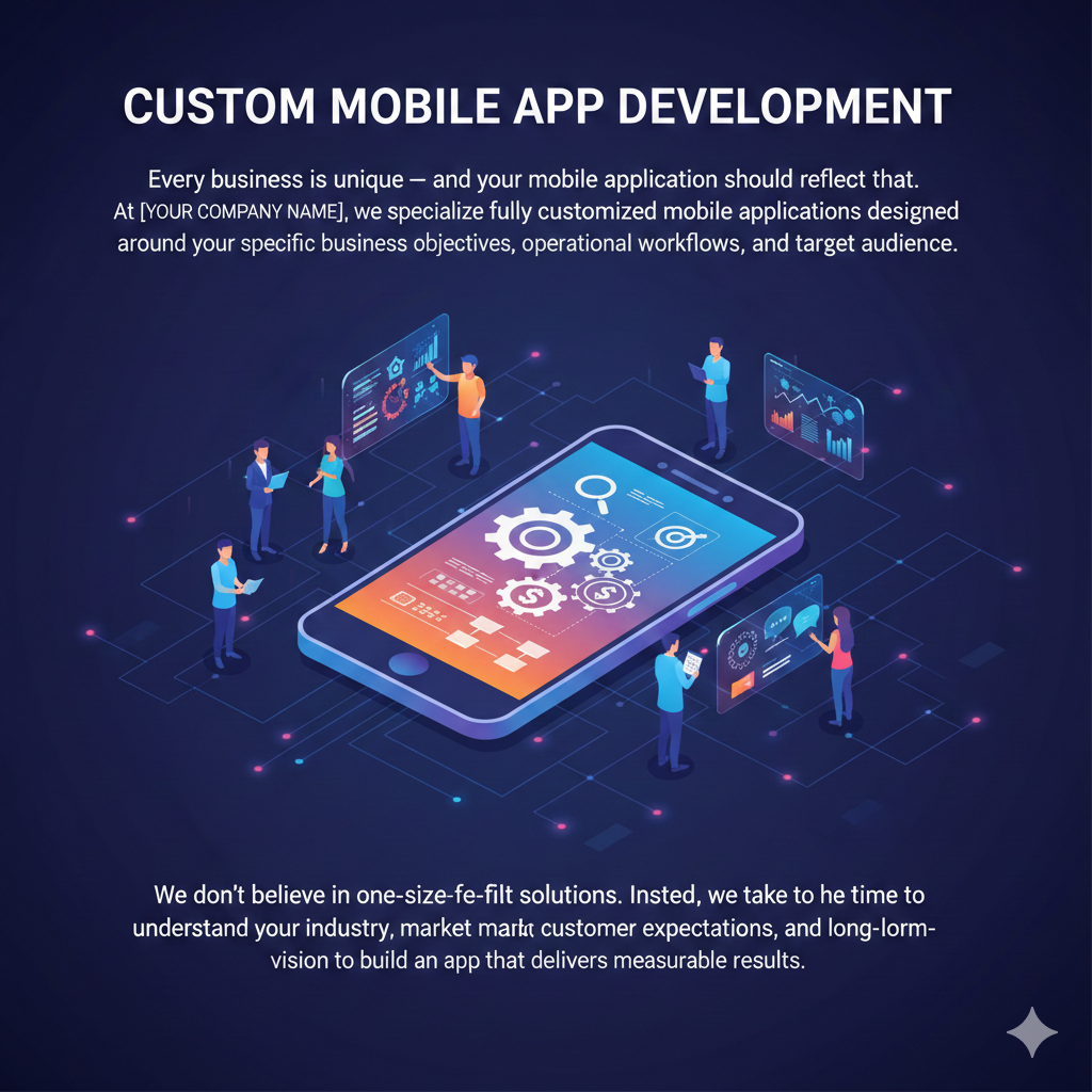 Every business is unique — and your mobile application should reflect that. At [Your Company Name], we specialize in developing fully customized mobile applications designed around your specific business objectives, operational workflows, and target audience.